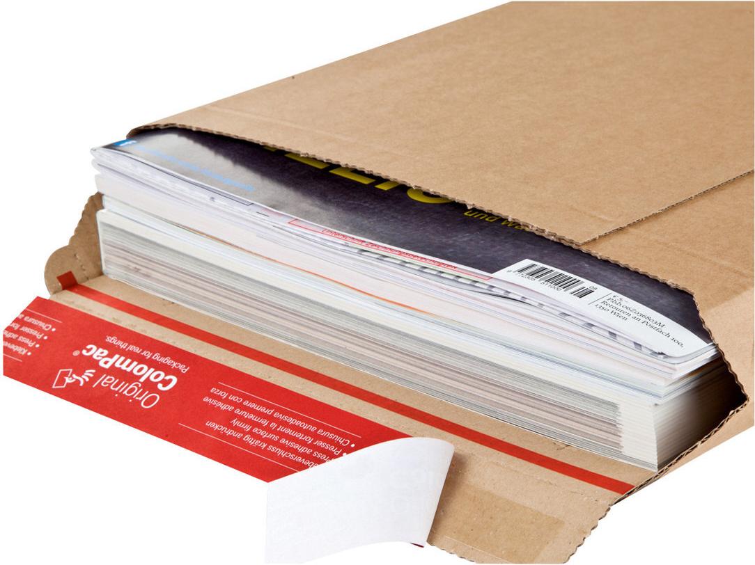 Packt selbst dicke Kataloge — die starke Versandtasche aus Wellpappe. Geeignet für Prospekte, Zeitschriften, Bücher, Versandhauskataloge und vieles mehr.