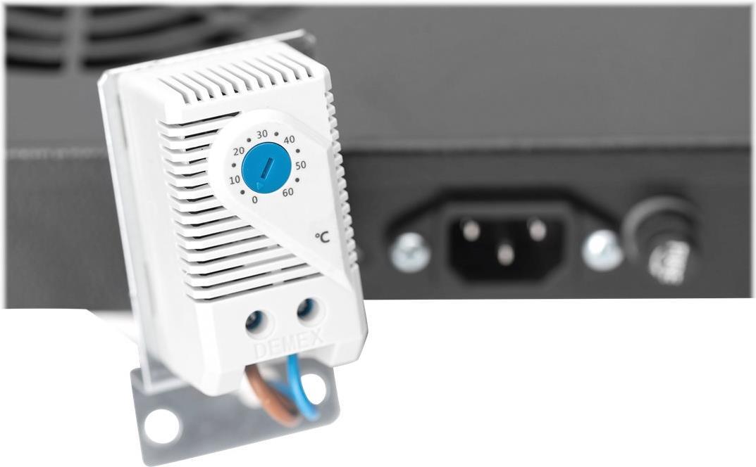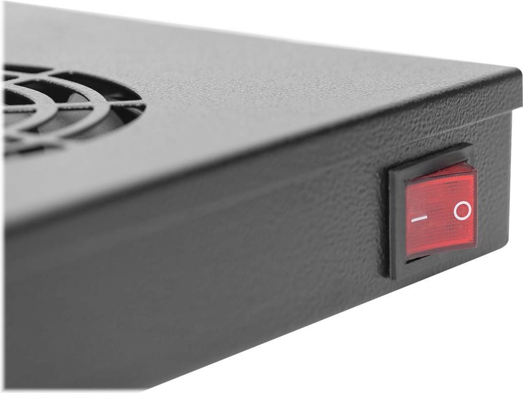 Die Dachlüftereinheiten sind variabel im 483 mm (19")-Schrank einsetzbar. Im Lieferumfang einer jeden Lüftereinheit sind zwei Sets von Montagwinkeln beigelegt. Mit dem Standard Set können Sie Ihre Lüftereinheit an beliebiger Höheneinheit Ihres Netzwerk- oder Serverschrankes befestigen. Das zweite Set Montagewinkel macht die Installation im Dach von 483 mm (19") Netzwerk- oder Serverschränken der varioFLEX Serie möglich. Ein Schalter, sowie ein regelbares Thermostat, sorgen für optimale Anpassungsmöglichkeiten. Das Modell ist erhältlich in den Standardfarben Grau (RAL 7035), sowie Schwarz (RAL 9005), wahlweise mit zwei oder vier Lüftern ausgerüstet.
