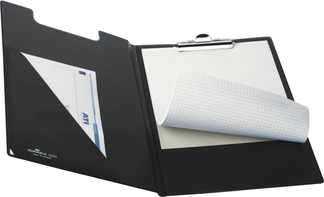 DURABLE Klemmbrett-Mappe, DIN A4, schwarz, aus Weichfolie mit Kartonverstärkung, große Dreiecktasche im Vorderdeckel (2355-01)