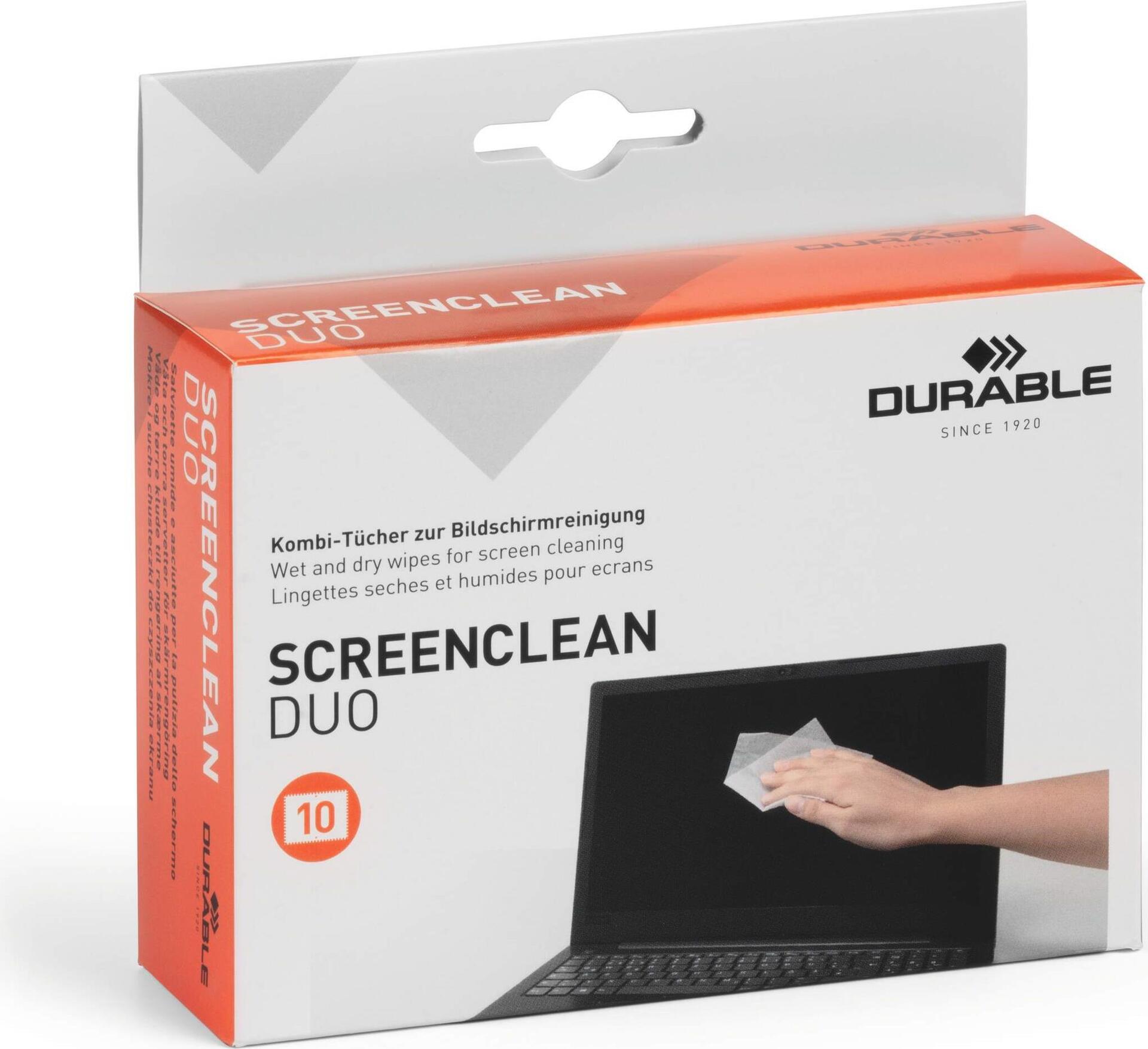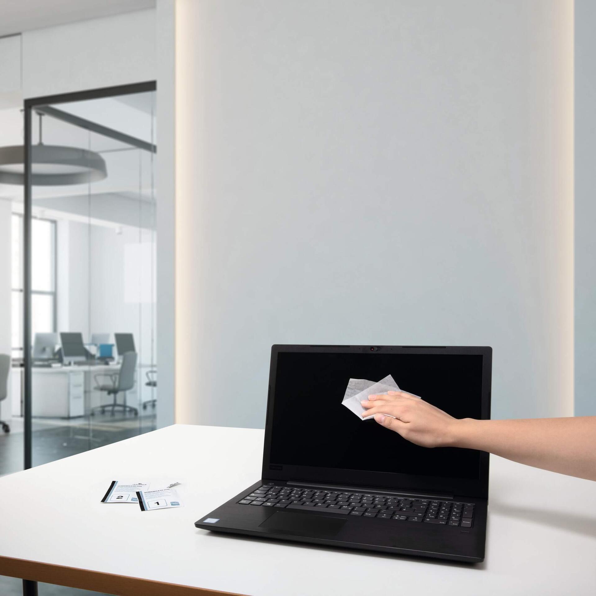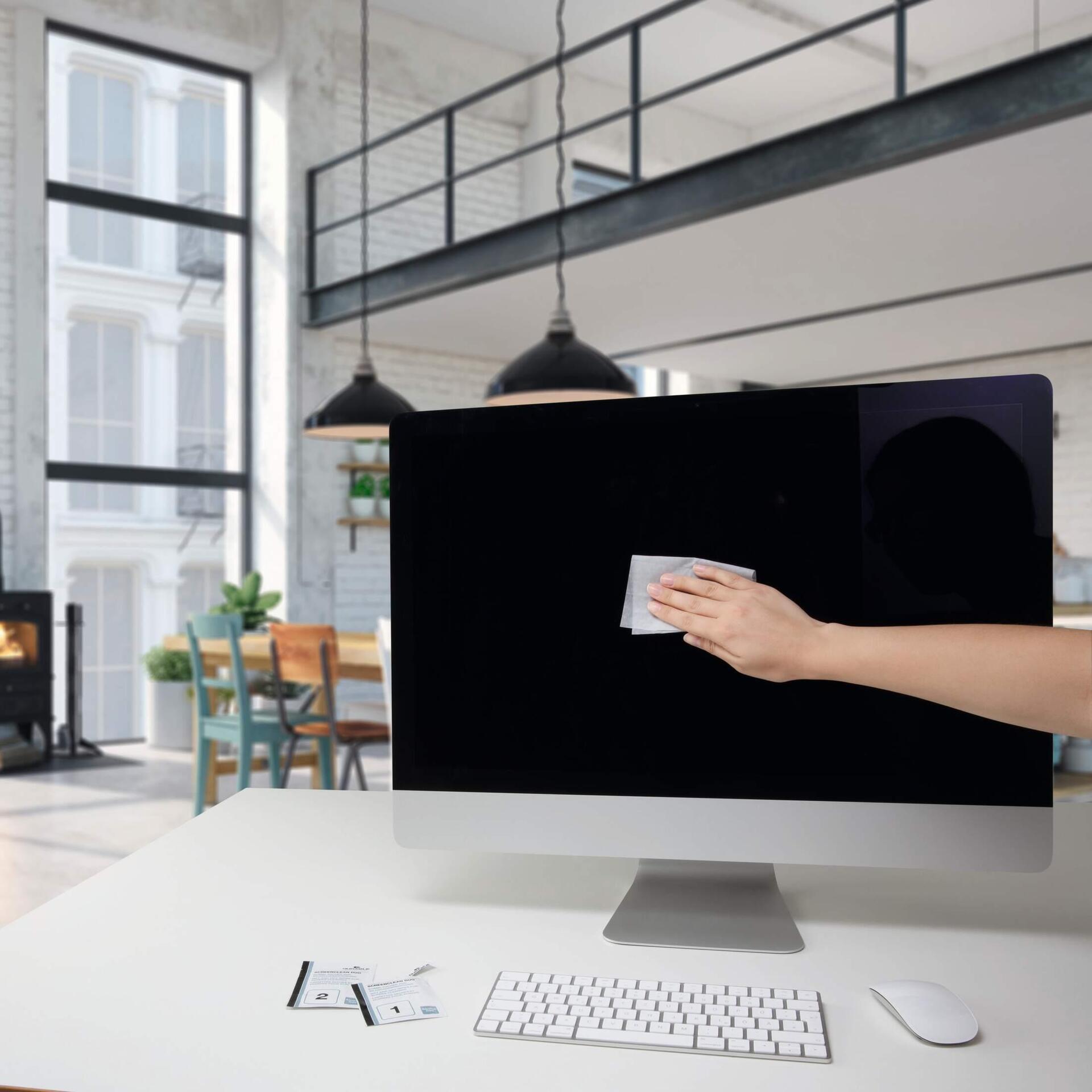 Einzeln verpackte Feucht-/Trocken-Reinigungstücher als Zweierset für die schnelle Bildschirmreinigung.