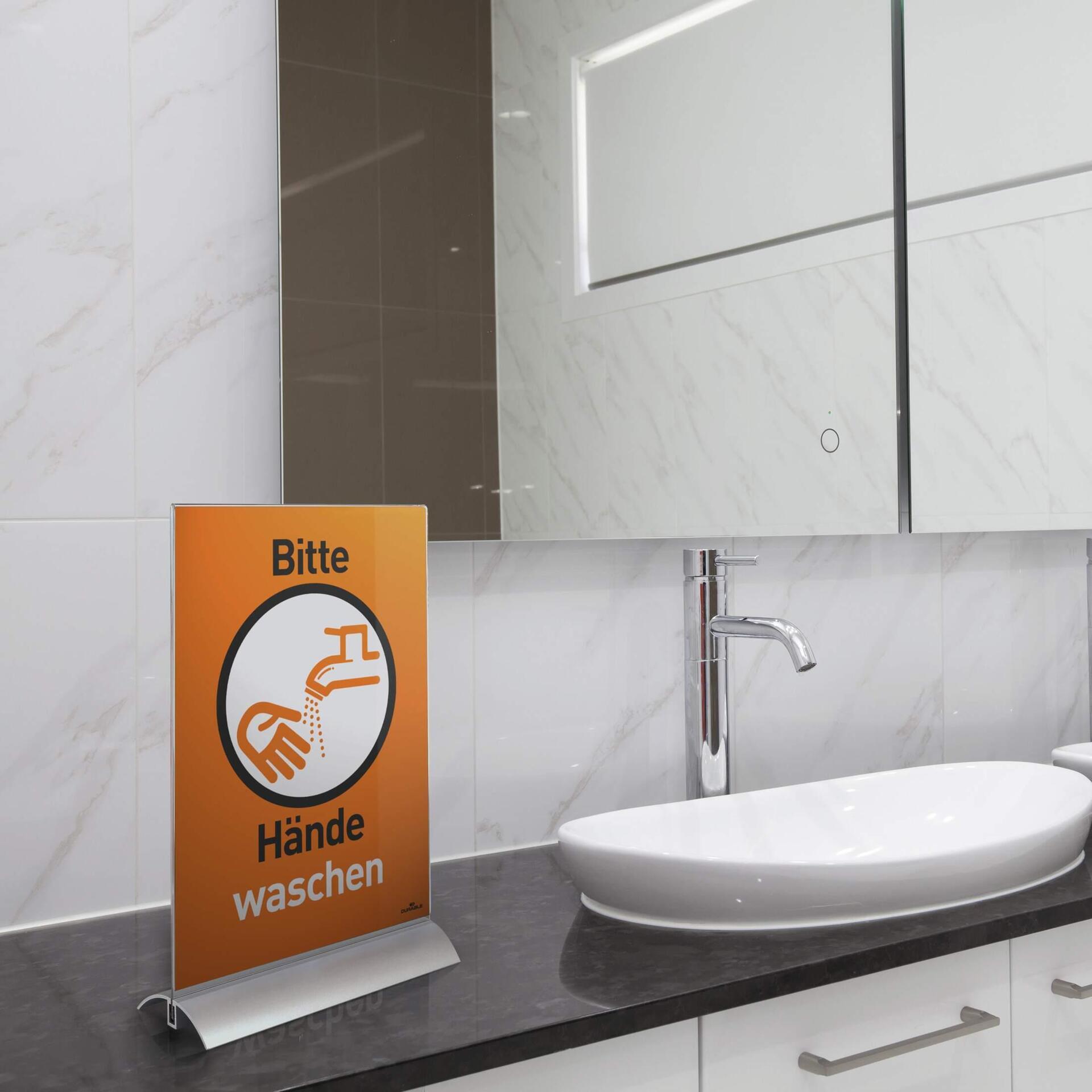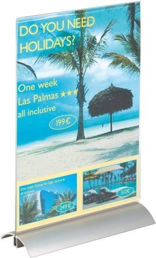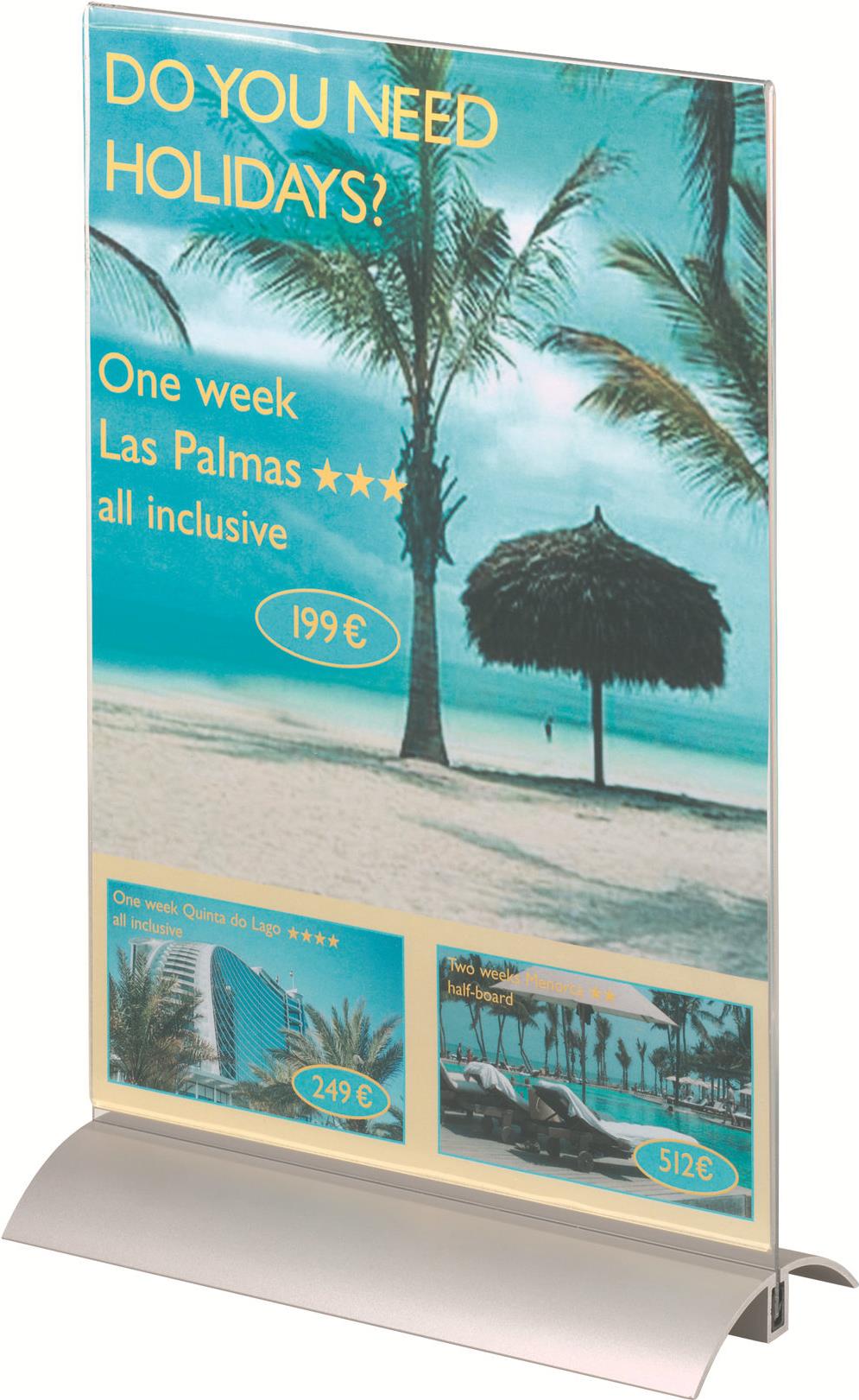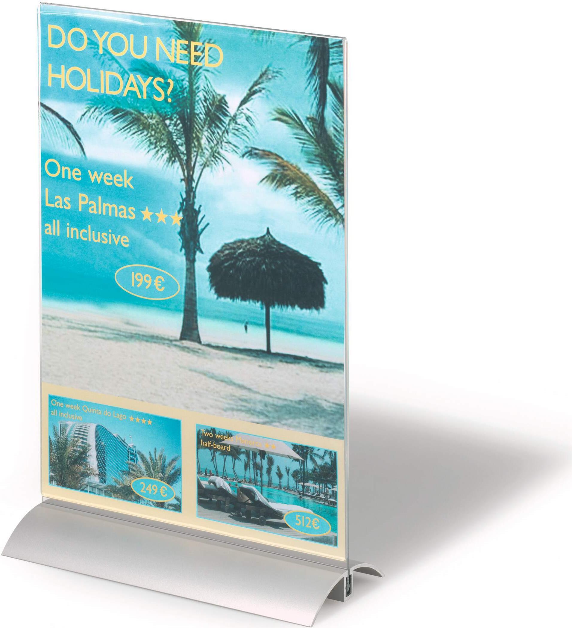 Die Informationen können leicht eingelegt und entnommen werden, ohne die Acrylplatte aus dem Aluminiumfuß zu entnehmen. Das einzigartige Klemmsystem hält die Acrylplatte sicher fest. Durch die beidseitige Lesbarkeit können Informationen auf kleiner Fläche dargestellt werden.