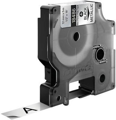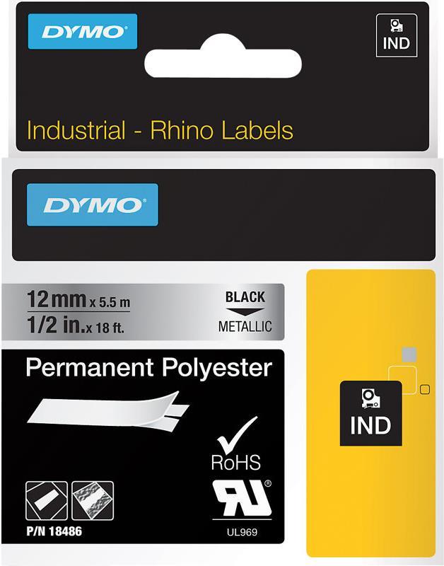 Dymo - Permanent haftendes metallisiertes Polyesterband - Schwarz auf Silber - Rolle (1,2 cm x 5,5 m) 1 Rolle(n) - für Rhino 4200, 6000, 6000 Hard Case Kit; RhinoPRO 1000, 3000, 5000 (18486)