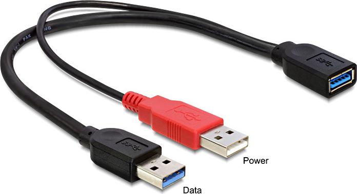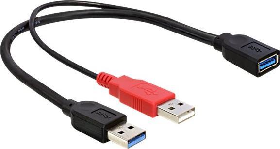 Dieses USB 3.0 Y-Kabel von Delock ermöglicht Ihnen mit Hilfe eines optionalen USB Anschlusskabels die Verbindung eines USB 3.0 Geräts, wie z. B. eines 2.5? HDD Gehäuses, Hubs oder Card Readers, mit Ihrem Notebook oder Ihrem PC. Der rote USB Anschluss dient zur zusätzlichen Stromversorgung, so dass auch zum Betrieb von Geräten mit hohem Stromverbrauch kein Netzteil benötigt wird.