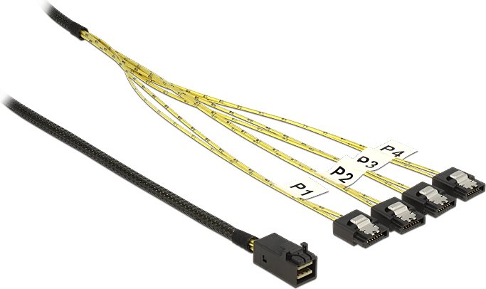 Dieses SAS Kabel von Delock dient zum Anschluss von z. B. bis zu 4 SATA Laufwerke an einen Controller mit Mini SAS HD x 4 SFF 8643 Anschluss.