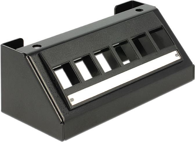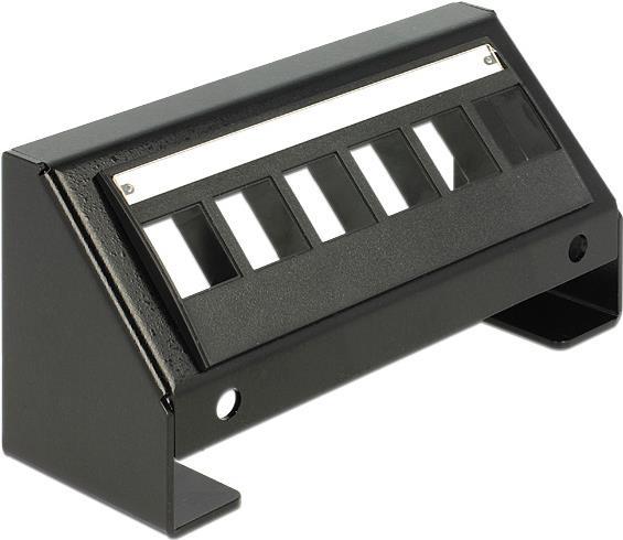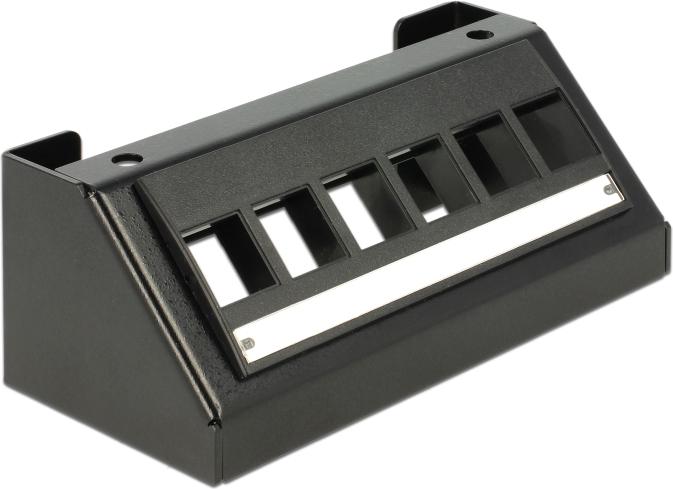 Dieses Panel von Delock können Sie als Kleinverteiler auf dem Tisch, an der Wand oder auf einem Kabelkanal verwenden. Zwei verschiedene Befestigungsmöglichkeiten erlauben eine vielseitige und flexible Installation. Durch die standardisierten Abmessungen ist es zur einfachen Snap-In Montage von 6 Keystone Modulen geeignet.