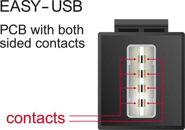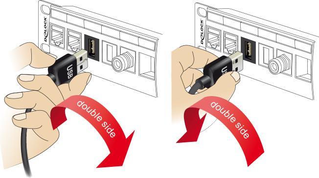 Dieses Modul von Delock kann z. B. zur Verlängerung eines USB-Kabels verwendet werden. Der EASY-USB-Stecker vereinfacht den Anschluss des Kabels, da der Stecker in beide Richtungen in die EASY-USB-Buchse gesteckt werden kann.