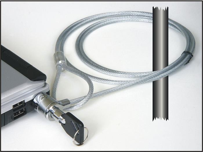 Mit diesem Delock Notebookschloss können Sie verschiedene Geräte, wie Notebook, Beamer, Monitor, etc. an jedem Ort sichern. Das 1,80m lange Stahlkabel mit Schlüssel-Schloss lässt sich ganz einfach um Gegenstände, wie z.B. Tischbein, Stuhl oder ähnliches anbinden und sichert somit Ihr Gerät vor Diebstahl.