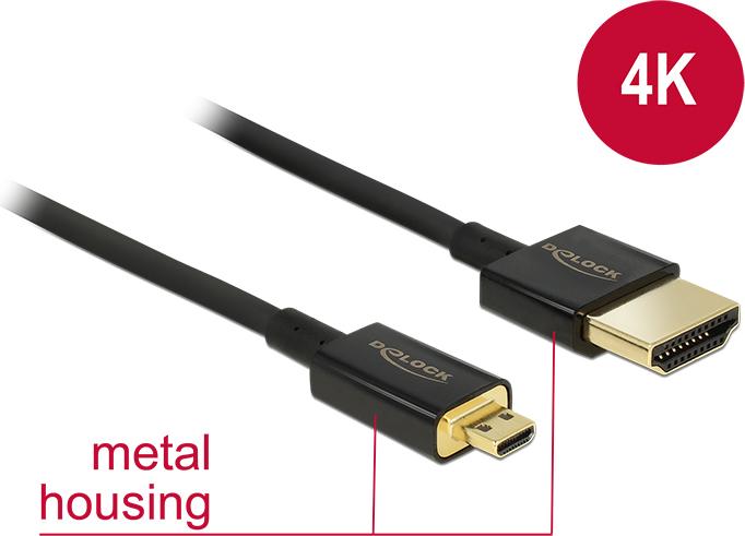 Delock Slim Premium - HDMI-Kabel mit Ethernet - 19 pin micro HDMI Type D männlich zu HDMI männlich - 1,0m - Dreifachisolierung - Schwarz - 4K Unterstützung (84781)