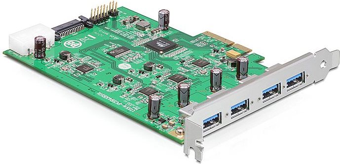 Diese Delock PCI Express Karte erweitert Ihren PC um 4 externe USB 3.0-A Ports. Sie können an die Karte verschiedene USB Geräte, wie z.B. Docking Stationen, Card Reader, externe Gehäuse etc. anschließen. Die Karte zeichnet sich durch die 4 USB 3.0 Host Controller aus, welche jeweils eine Lane des PCI Express Busses mit 5 Gb/s nutzen können.