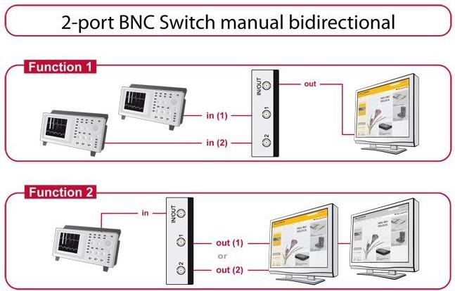 Dieser BNC-Schalter von Delock ist ein manueller bidirektionaler Schalter zum Anschluss verschiedener Geräte mit BNC-Anschluss. Dieser Schalter bietet zwei verschiedene Anwendungen.