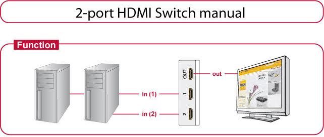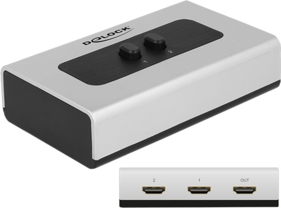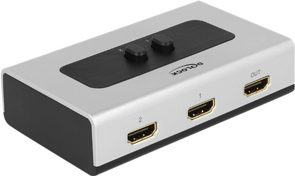 Mit dem Delock HDMI-Switch können Sie 2 HDMI-Geräte an einem HDMI-Monitor, TV oder Beamer etc. betreiben. Mit Hilfe einer der 2 Tasten können Sie manuell auswählen, welcher Computer mit dem HDMI-Gerät verbunden werden soll.