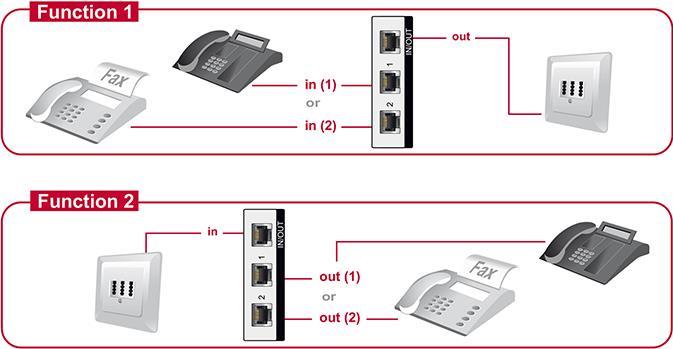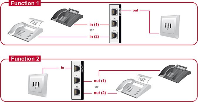 Es können zwei Geräte mit RJ11 Anschluss, z. B. Telefon oder Fax, an einen RJ11 Anschluss angeschlossen werden. Es kann ein Gerät mit RJ11 Anschluss an zwei RJ11 Leitungen angeschlossen werden.
