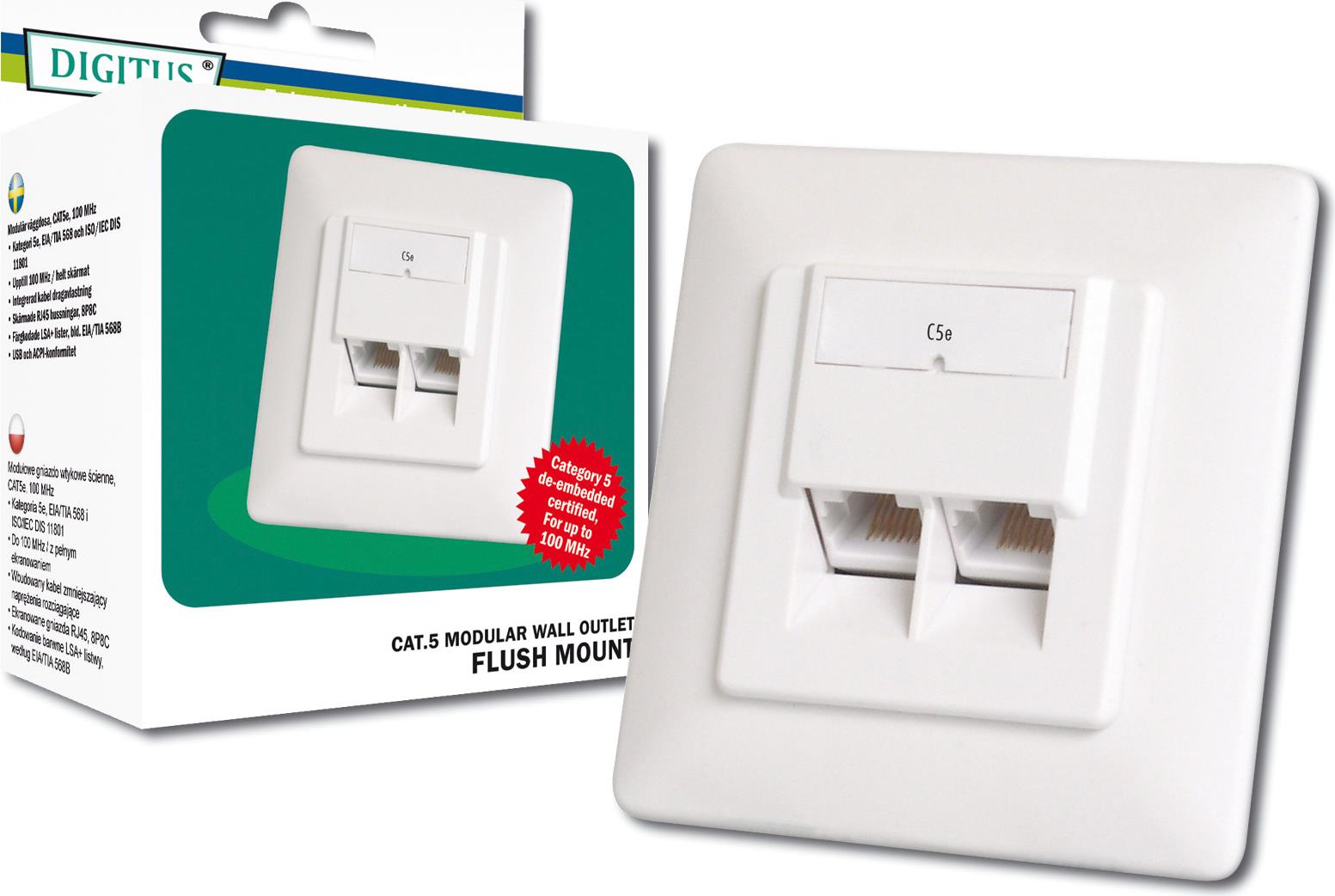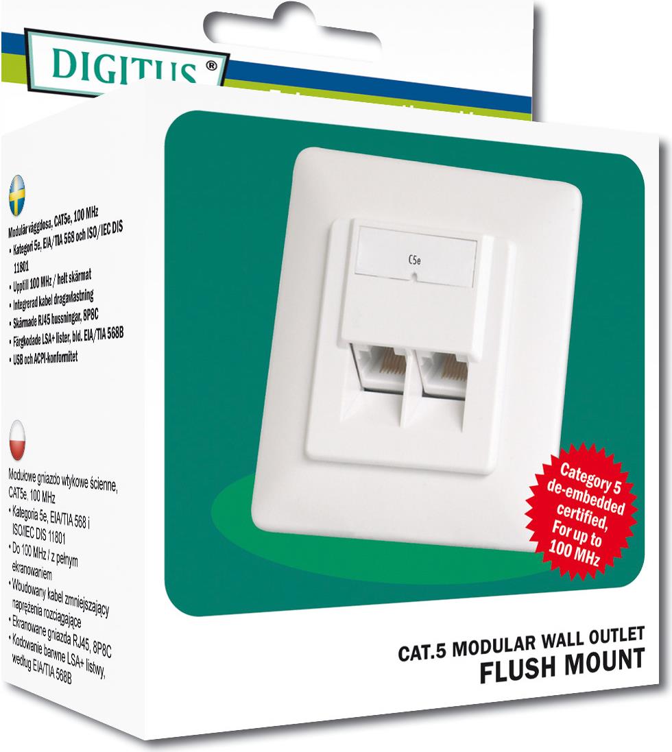 Die geschirmten CAT 5e Datenanschlussdosen von DIGITUS® sind zertifiziert nach CAT 5e EIA/TIA 568 und ISO/IEC 11801, EN 50173. Kabelinstallation erfolgt über LSA-Leisten, farbcodiert nach EIA/TIA 568 B bei horizontaler Kabeleinführung. Alle Datenanschlussdosen von DIGITUS® sind erhältlich als Unterputz- oder Aufputzversion.