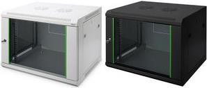 Die Netzwerkschränke zur Wandmontage der Dynamic Serie wurden für einen einfachen und besonders kostenoptimierten Netzwerkausbau entwickelt. Dach, Boden und Rückwand eines jeden Schrankes sind mit einem vorgestanzten Kabeleinlass ausgestattet. Für die Aufnahme eines Lüftermoduls wird das Dachchassis ebenfalls mit einem ausgestanzten Bereich versehen. Zwei Paar galvanisierte, mit in beide Richtungen ablesbare Höheneinheiten beschriftete 483 mm (19")-Profilschienen sind im Inneren verbaut. Diese lassen sich in der Tiefe verstellen. Jeder Schrank ist eine robuste Stahlkonstruktion aus bis zu 1,5 mm starkem Stahlblech. Die Farbgebung erfolgt in Form von elektrostatischer Pulverbeschichtung in den Standardfarben Grau (RAL 7035) und Schwarz (RAL 9005). Abnehmbare Seitenwände sowie die abschließ- und abnehmbare Fronttür, verbessern die Zugänglichkeit. Ein Türanschlagswechsel kann vorgenommen werden. Die Wandmontage erfolgt in zwei einfachen Arbeitsschritten: Das mitgelieferte Montageblech wird an die Wand geschraubt und im Anschluss mit dem Gehäuse verbunden.