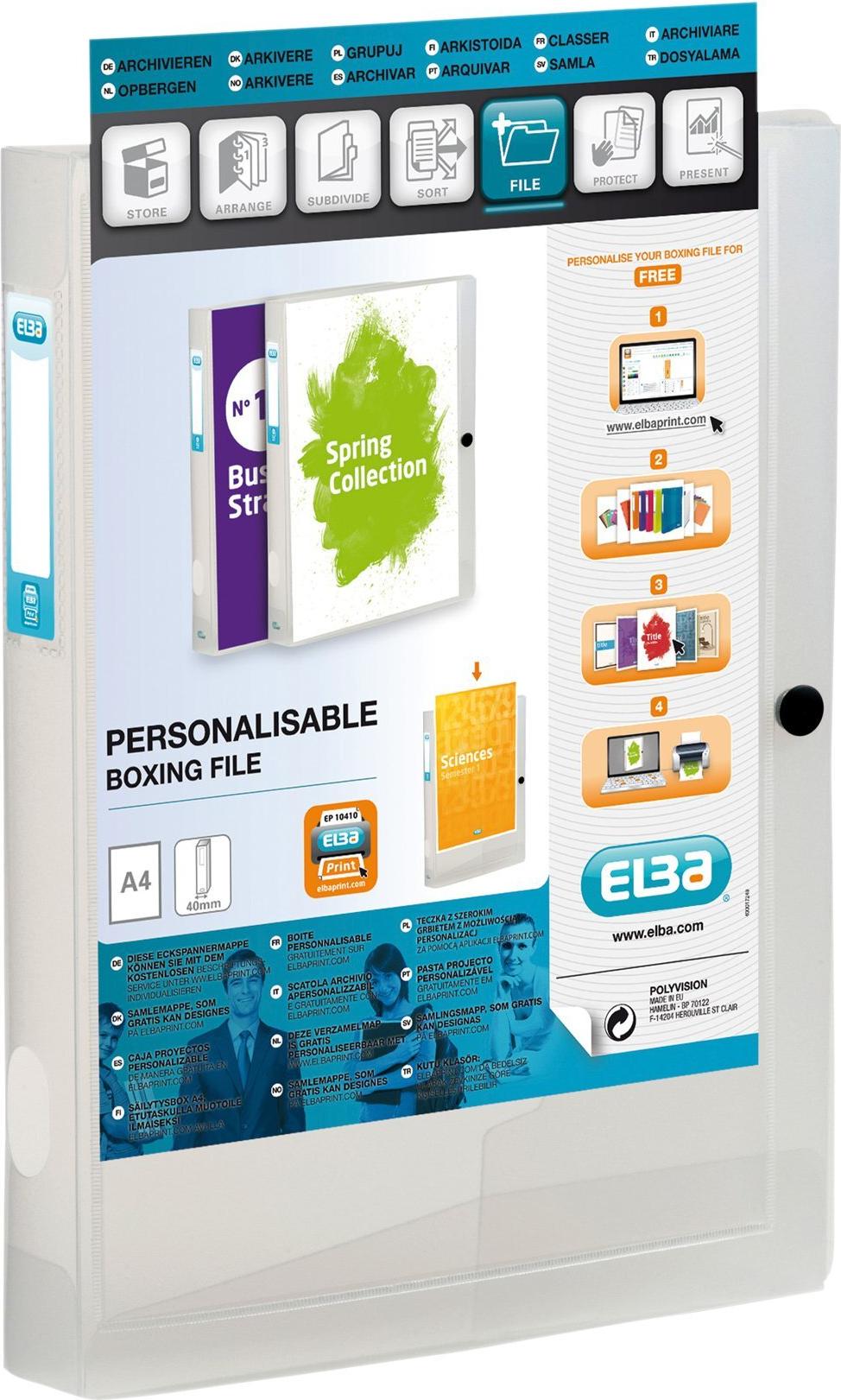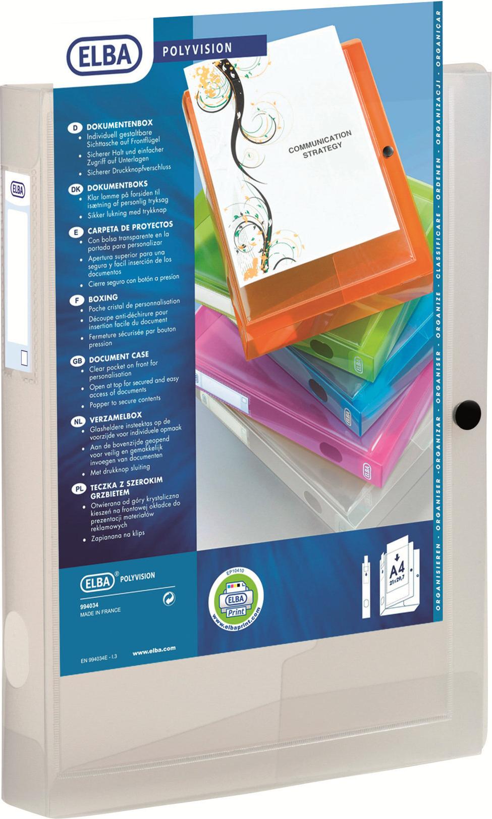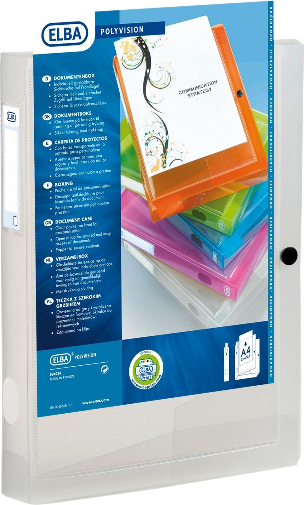 ELBA Sammelbox POLYVISION, A4, PP, Füllhöhe: 40 mm, farblos transparente Sichttasche auf dem Vorderdeckel, transparent, Druckknopf für sicheren Verschluss, Griffloch am Rücken, für ca. 400 Blatt A4, Maße: (B)250 x (T)40 x (H)333 mm (994034-17/994034 FL / 100200142)