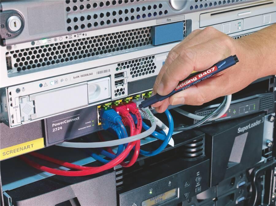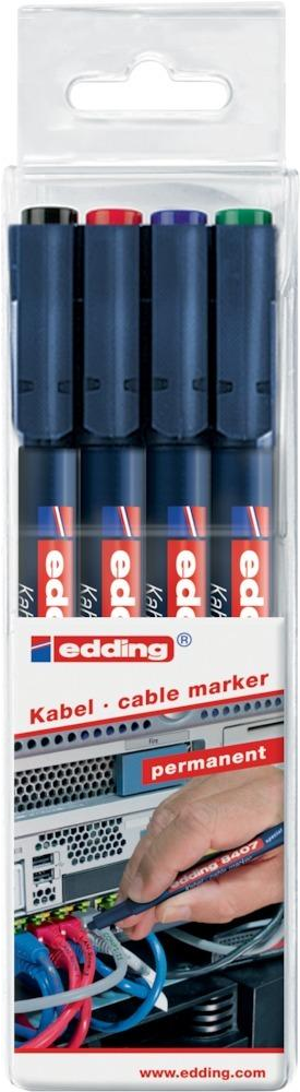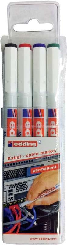 Kabelmarker e-8407 4er SetKabelmarker speziell zum besonders feinen Beschriften, Markieren und Kennzeichnen von Kabeln verschiedener Art. Wasserfeste Tusche, lichtbeständig und schnell trocknend. Auch zum Beschriften von Kunststoffen, Glas und Diarahmen geeignet. Wasser- und Abriebbeständig.Technische Daten: Farbe: Schwarz,Rot,Blau,GrünInhalt: 4 St.Permanent-Marker-Typ (Kategorisierung): KabelmarkerSicherheitshinweise EU / Gefahrenbezeichnung: F: LeichtentzündlichSicherheitshinweise EU / R-Sätze: R 11: Leichtentzündlich (F),R 67: Dämpfe können Schläfrigkeit und Benommenheit verursachen (Z)Sicherheitshinweise EU / S-Sätze: S 16: Von Zündquellen fernhalten - Nicht rauchenSpitzenform: RundformStrichbreite (max.): 0.3 mmTyp (Hersteller-Typ): 4-8407-4