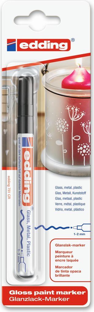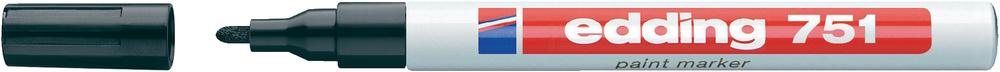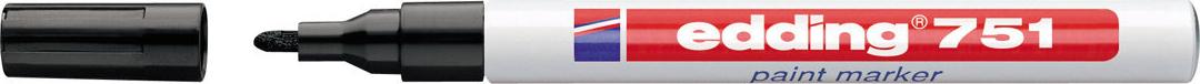 edding 751 paint markerHitzebeständig bis 300°CLackmarker sind ideal für alle dauerhaften Markierungen auf unterschiedlichsten Materialien, z.B. Glas, Metall, Kunststoff, Papier oder Holz. Dank der hohen Deckkraft sind Markierungen auf dunklen oder transparenten Oberflächen besonders brillant. Ausstattung: Lackmarker mit Rundspitze. Pigmentierte, schnelltrocknende, lackartig deckende Tusche. Wasserfest, geruchsarm und hitzebeständig bis 300°C. Technische Daten: Farbe: SchwarzInhalt: 1 St.Permanent-Marker-Typ (Kategorisierung): Paint-MarkerSicherheitshinweise EU / Gefahrenbezeichnung: F: LeichtentzündlichSicherheitshinweise EU / R-Sätze: R 11: Leichtentzündlich (F)Sicherheitshinweise EU / S-Sätze: S 9: Behälter an einem gut belüfteten Ort aufbewahren,S 16: Von Zündquellen fernhalten - Nicht rauchen,S 29: Nicht in die Kanalisation gelangen lassen,S 33: Maßnahmen gegen elektromagnetische Aufladungen treffen,S 3/7: Behälter dicht geschlossen halten und an einem kühlen Ort aufbewahrenSpitzenform: RundformStrichbreite (max.): 2 mmStrichbreite (min.): 1 mmTyp (Hersteller-Typ): 751
