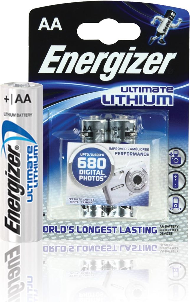 Die weltweit langlebigste AA- und AAA Batterie in Hightech-Geräten.Produkttext[/head] Energizer Lithium AA/R6/Mignon Batterien, Blister mit 2 Stück • Bis zu 8x längere* Batterie-Lebensdauer in Digitalkameras• Bis zu 8x weniger Abfall** • 15 Jahre lagerfähig • 33 % weniger Gewicht im Vergleich zu Standard-Alkali-Batterien • Topleistung selbst bei extremen Temperaturen von –40° C bis zu +60° C • Konstruktionsbedingter Schutz gegen Auslaufen*in High-drain-Digitalkameras im Vergleich zu Energizer® Standard Alkali-Batterien; Ergebnisse variieren je nach Gerät. **Verbrauchen Sie weniger Batterien, verursachen Sie weniger Abfall.[head]Hauptmerkmale