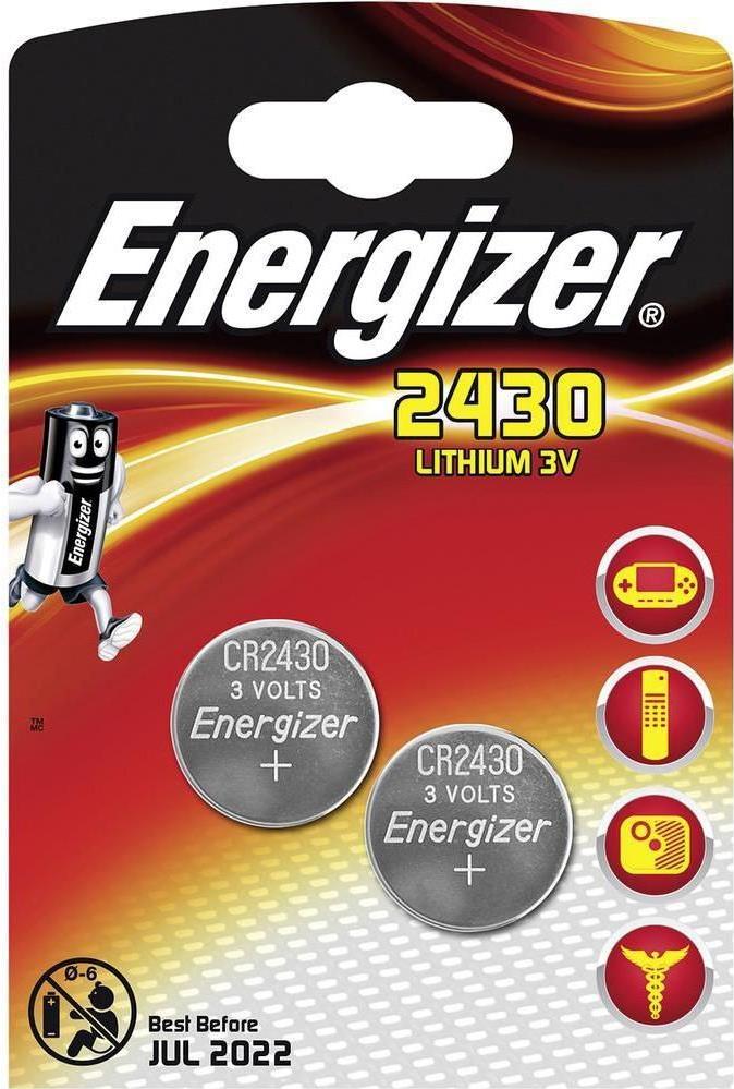 Energizer Knopfzelle Lithium CR 2430Kapazität 290 mAh2er-SetTypische Einsatzgebiete sind: Armbanduhren, Datenbanken, Fernbedienungen, div. Taschenlampen, Taschenrechner, Film- und Fotogeräte usw. 10 Jahre lagerfähig.Technische Daten: Batterie-, Akku- Technologie: LithiumBatterie-, Akku- Vergleichstypen: BR2430, DL2430, ECR2430, KCR2430, KL2430, KECR2430, LM2430, 5011LC, L20, L-F1/2WBatterie-, Akku-Größe: CR 2430Batterie-Art (Kategorisierung): KnopfzelleInhalt: 2 St.Kapazität (mAh, Ah): 290 mAhProduktabmessung, Höhe: 3 mmProduktabmessung, Ø: 24.5 mmSpannung: 3 V