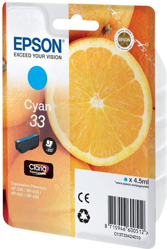 Epson 33 - 4,5 ml - Cyan - original - Blisterverpackung - Tintenpatrone - für Expression Home XP-635, 830; Expression Premium XP-530, 540, 630, 635, 640, 645, 830, 900 (C13T33424010)