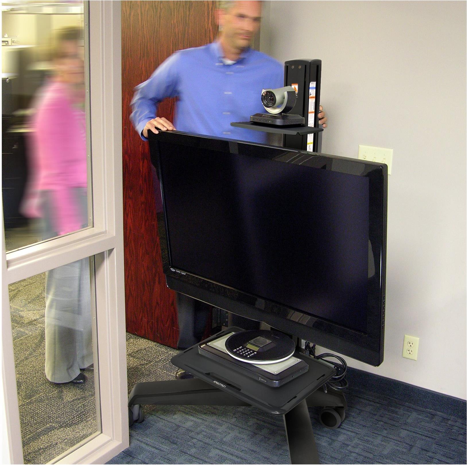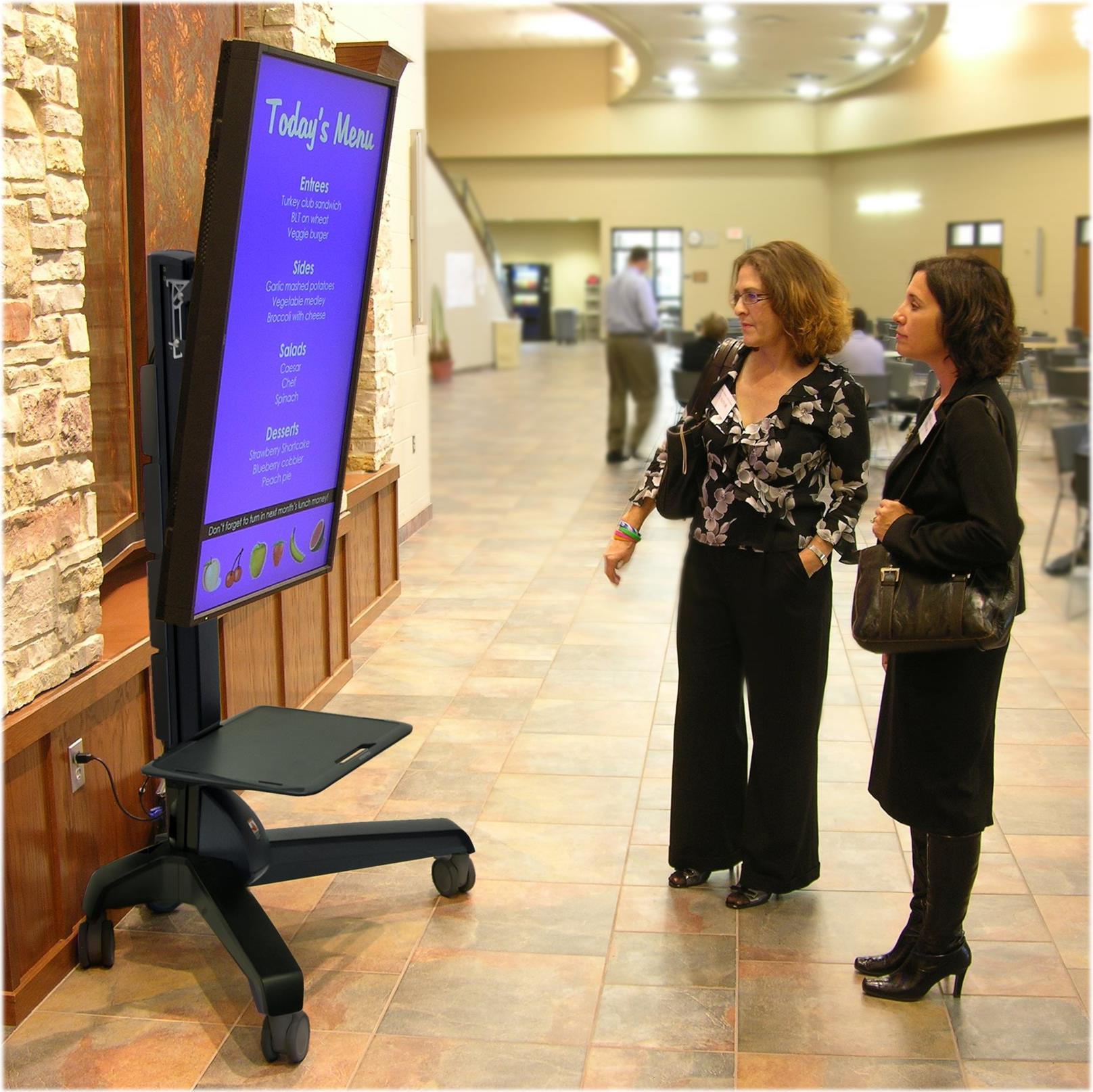 Dieser Fahrwagen steigert Ihre Investition durch seine vielseitigen Projektionsmöglichkeiten. Zu den Funktionen zählen Landscape-/Portrait-Modus, mühelose Höhenverstellung um bis zu 51 cm sowie eine unabhängige Anzeigeneigung um bis zu 20°. Optimale Positionierbarkeit für sitzende und stehende Zuschauer in jeder Anwendung und in jedem Bereich Ihrer Einrichtung. Mit einer leichten Berührung einstellbar - ohne Knöpfe und Hebel.
