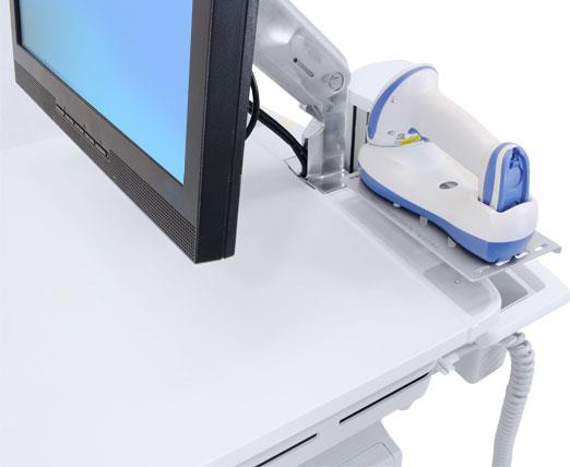 Dieses praktische Regal bietet dem Unterteil eines drahtlosen Scanners in einer bequemen Arbeitshöhe Platz auf StyleView-Wagen. Es lässt sich an der Arbeitsfläche und auf der Rückseite des Wagens befestigen, kann aber auch problemlos in ein Wandschienensystem integriert werden.