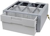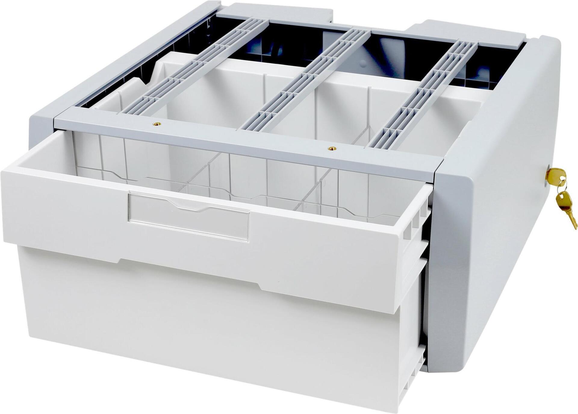Die Zweitschublade wird unter der Hauptschublade eines Wagens befestigt und bietet zusätzlichen Aufbewahrungsplatz. In der Einzelschubladenversion ist eine einzige, große Schublade vorgesehen. Diese Schublade funktioniert in Verbindung mit dem selbstverschließenden, elektronischen Schubladensystem des Wagens.