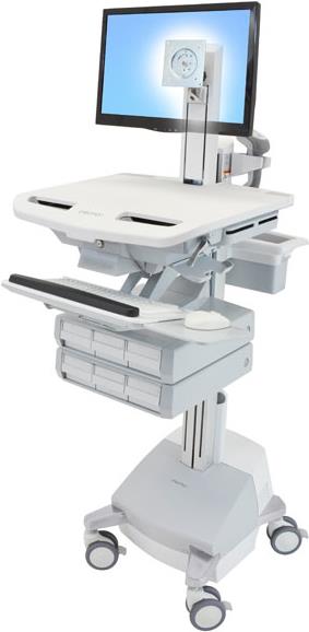 Bleiben Sie produktiv und auf dem neuesten Stand - mit unserem zertifizierten Stromversorgungssystem. Dieser innovative, ergonomische und leicht zu handhabende medizinische Fahrwagen verfügt über eine stufenlose Höhenverstellfunktion für stehende und sitzende Tätigkeiten und eine einstellbare, nach hinten neigbare Tastaturablage. Sein selbstverschließendes Schubladensystem ermöglicht ein einfaches und effizientes Management nicht süchtig machender Medikamente.