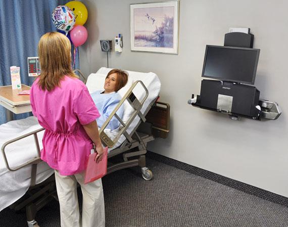 Beständige Konstruktion aus poliertem Aluminium! Besitzt darüber hinaus eine Ablagefläche mit ausziehbarer Tastaturablage, die den Arbeitsablauf des medizinischen Personals unterstützt. Dank des großen Höhenverstellbereichs können Sie im Sitzen oder Stehen arbeiten. Der Arm lässt sich auch aus- und einklappen, sodass Sie ihn aus dem Weg schieben können, wenn er nicht benötigt wird. Dank des LCD-Höhenverstellbereichs von 51 cm† können Sie mit dem Arm im Sitzen oder Stehen arbeiten. Ein einzigartiges Kabelführungssystem verdeckt und ordnet die Kabel und erleichtert so die Reinigung.