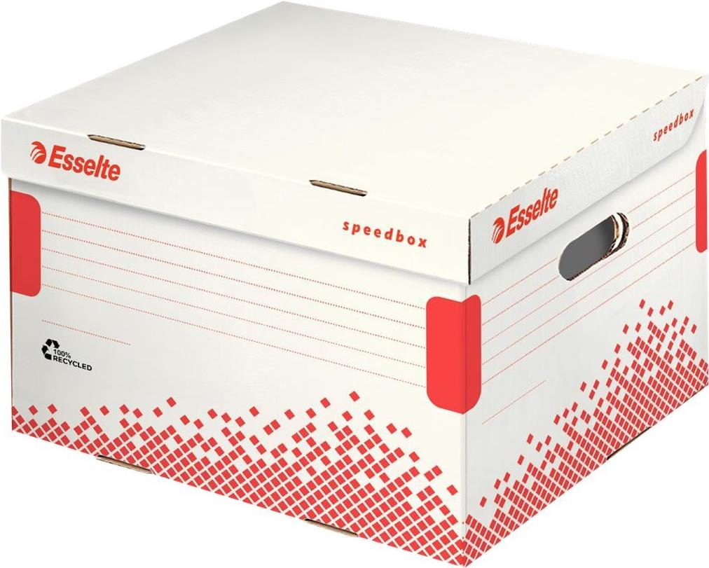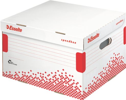 Esselte Archiv-Klappdeckelbox SPEEDBOX, Große: L, weiß/rot, aus 100% recycelter Pappe, zu 100% wiederverwertbar, FSC - 15 Stück (623913)