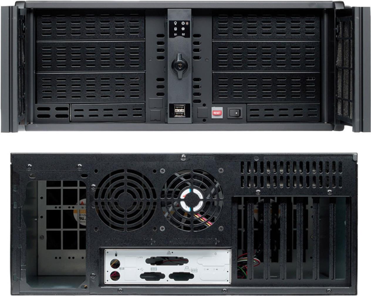 4HE Aluminium Gehäuse mit 6x 13,30cm (5,25") + 2x 3.5" Einschüben offen, 2x 3.5" innen. Ohne Netzteil. Die Gehäusefarbe ist schwarz.