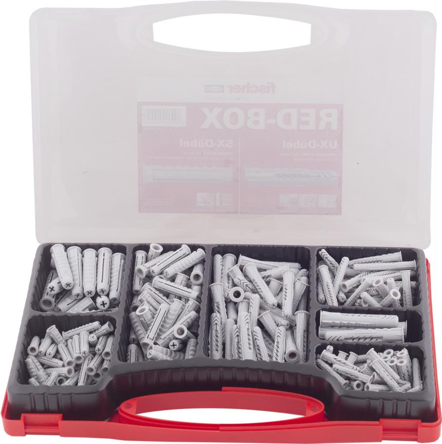 Die praktische Sortimentsbox mit fischer Universaldübel UX und fischer Spreizdübel SX.
