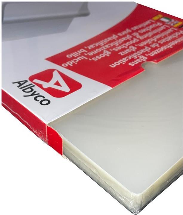 Die Laminiertaschen von Albyco sind standardmäßig mit abgerundeten Ecken versehen. Die Laminiertaschen bzw. Laminierbögen sind rundum 3 mm größer als das DIN-A-Format. Das bedeutet, dass die Bögen während des Laminierens/Plastifizierens vollständig umschlossen bzw. gekapselt sind. Dadurch bleiben die laminierten Bögen vollständig wasserdicht. Die Kunststoffschicht der Albyco-Laminiertaschen ist aus PET gefertigt. Dieses Material ist absolut transparent und recycelbar. In Kombination mit dem hochwertigen EVA-Kleber mit festem Schmelzpunkt und konstanter Viskosität wird beim Laminieren praktisch kein Kleber aus den Taschen auf die Walzen gepresst. Das schont Ihr wertvolles Laminiergerät, es entstehen keine matten Leimstreifen auf den laminierten Taschen und die Walzen benötigen deutlich weniger Wartung. Albyco-Laminiertaschen sind mit einer einzigartigen antistatischen Oberfläche versehen. Dadurch können Sie Ihre Drucke und Druckerzeugnisse schneller und genauer in den Hüllen positionieren. Albyco liefert Laminierhüllen in vielen Größen, von 59 x 83 mm bis zum A2-Format, von 2 x 68 Mikron bis 2 x 250 Mikron, in glänzend oder matt. Darüber hinaus bietet Albyco Sondertypen an, wie z. B. Hüllen mit Mehrfachperforation, selbstklebende Laminierhüllen und Display-Laminierhüllen in DIN-A-Großformaten.