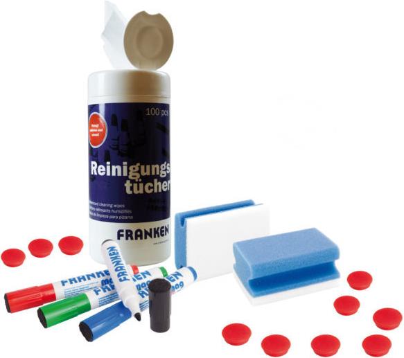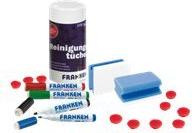 Schreibtafel-Set Z1955 bestehend aus: 4 Stück KombiMarker MagWrite (mit Schwamm und magnetischer Kappe, je 1 in rot, grün, blau und schwarz), 1 Dose feuchte Reinigungstücher (mit antistatischer Wirkung, biologisch abbaubar, umweltfreundlich, 100 Stück), 2 Reinigungsschwämme X-Wipe! (speziell für stark verschmutzte Schreibtafeloberfläche, entfernt sogar permanente Marker), 10 farbige Magnete (Durchmesser 32 mm, Haftkraft 800 g)!