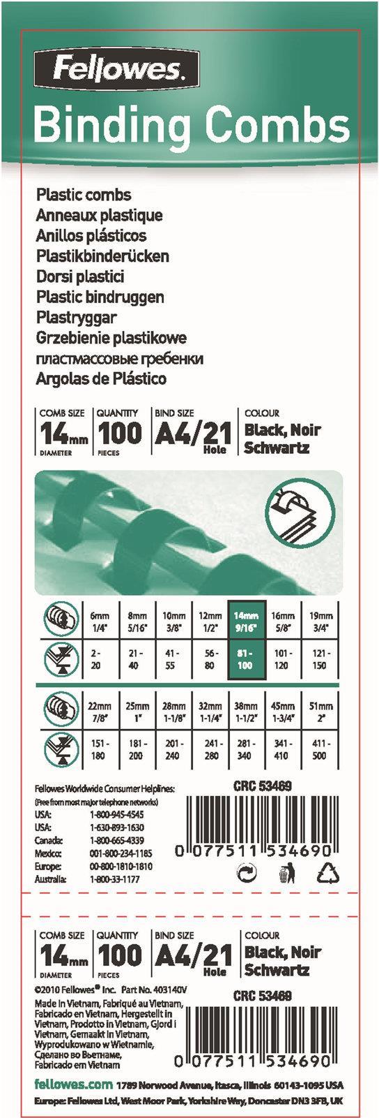 Fellowes - 14 mm - 300 mm - 21 Ringe - A4 (210 x 297 mm) - 100 Blätter - Schwarz - 100 Stck. Bindekamm aus Kunststoff - für Fellowes Galaxy 500, Galaxy E, Galaxy E 500, Pulsar 300, Quasar 130, Quasar E 500 (53469)