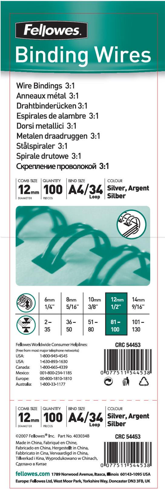 Fellowes - Bindedraht - 12 mm - 34 Ringe - A4 (210 x 297 mm) - 100 Blätter - Silber - 100 Stck. - für Fellowes Galaxy 500, Galaxy E 500, Pulsar 300, Starlet 90 (54453)