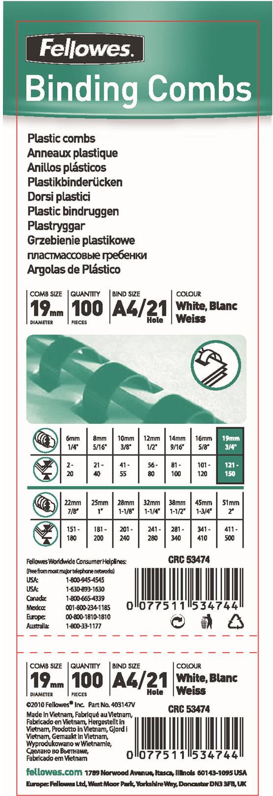 Fellowes Plastic Comb - Plastic binding comb - 19 mm - 30cm - A4 (210 x 297 mm) - 150 Blätter - weiß - 100 Stck. - für Fellowes Galaxy 500, Galaxy E 500, Pulsar 300, Pulsar-E 300, Quasar E 500 (5347403)