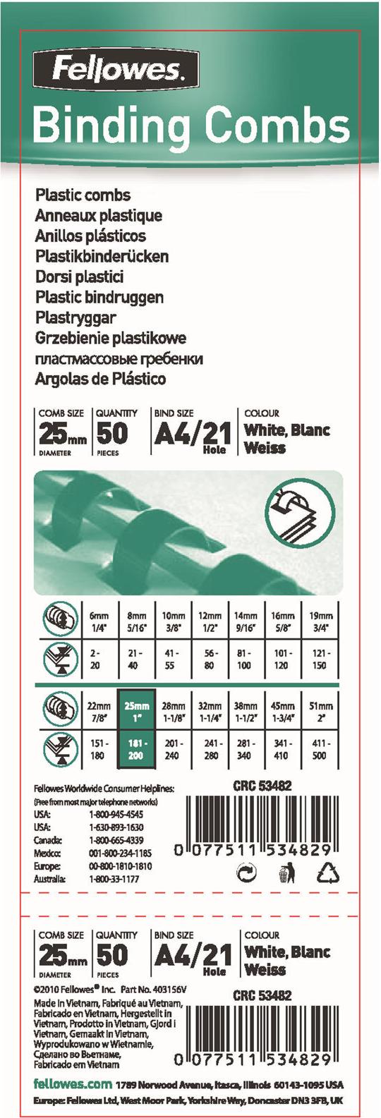 Fellowes Plastic Comb - 25 mm - 30cm - 21 Ringe - A4 (210 x 297 mm) - 240 Blätter - weiß - 50 Stck. Bindekamm - für Fellowes Galaxy 500, Galaxy E 500, Pulsar 300, Starlet 90 (5348202)