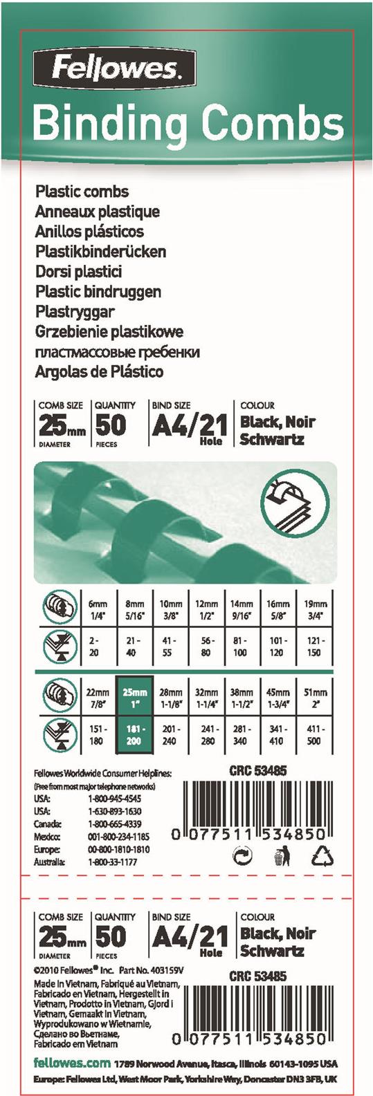 Fellowes Plastic Comb - 25 mm - 30cm - 21 Ringe - A4 (210 x 297 mm) - 240 Blätter - Schwarz - 50 Stck. Bindekamm aus Kunststoff - für Fellowes Galaxy 500, Galaxy E 500, Pulsar 300, Pulsar-E 300, Quasar E 500 (5348502)