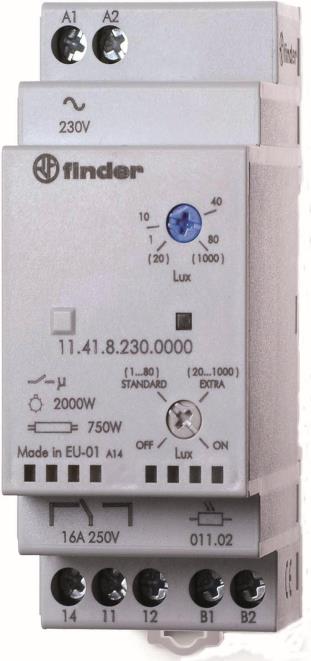 Dämmerungsschalter für 35 mm DIN-Schiene, Serie 11.41.8.230Dämmerungsschalter zur lichtabhängigen Steuerung von Beleuchtungsanlagen mit separatem Lichtsensor für den Verteilereinbau. Geringer Energieverbrauch, Modulbaubreite 35 mm. Patentiertes \"\"Null-Hysteresis-Prinzip\"\" zur Energieeinsparung.Technische Daten: Betriebsspannung: 230 V/50 - 60 HzEinschalt-Strom: (< 5 ms) Max. 120 AEinschalt-Verzögerung: 15/30 sEmpfindlichkeit: (Standard/hoher Bereich) 1 - 80/30 - 1000 lxHerst.-Teilenr.: 11.41.8.230.0000Kontaktart: 1 WechslerKontaktmaterial: AgSnO2Schaltleistung: (AC1) 16 A/250/V/AC/Max. 4000 VA/(AC15, 230 V) Max. 750 VASchaltspannung: 250 V/AC/Max. 400 V/ACSchaltstrom: (AC1, 230 V/AC) 16 ASchutzart: Dämmerungsschalter: IP20/Lichtsensor: IP54Typ: 11.41.8.230.0000Umgebungs-Temperatur: -20 - +50 °CLieferumfang: Lichtsensor.Hinweis: Zulassung IMQ.
