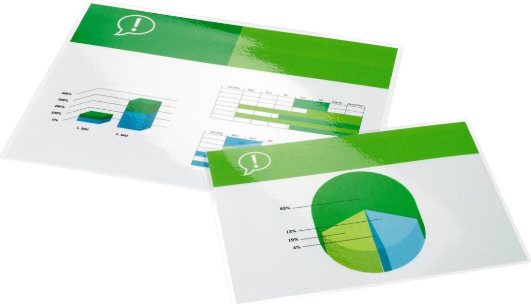 Laminiertaschen sind eine praktische Lösung im Alltag zum Schutz und zur Aufwertung von häufig verwendeten Dokumenten, wie Präsentationen, Referenzlisten, Produktblättern oder Fotos, 2 x 125 Mikron, glänzend, Format A2. 100 Stück.