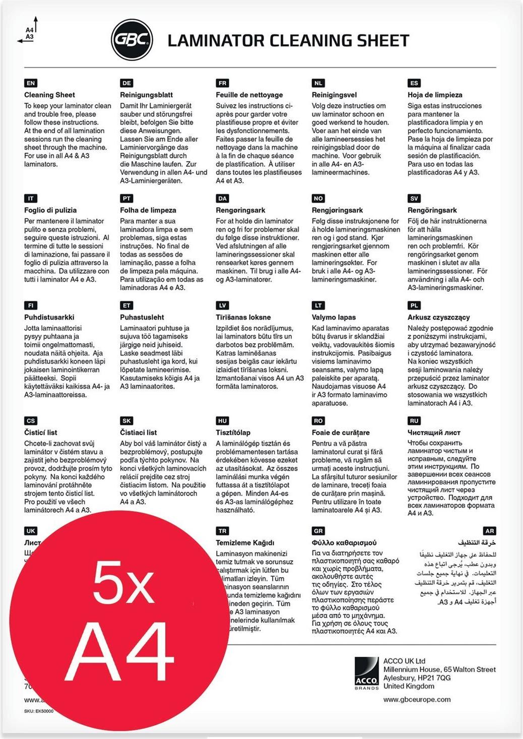 Diese A4-Reinigungsblätter für Laminiergeräte von GBC wurden speziell dafür entwickelt, Papierstaus zu verhindern, indem sie überschüssigen Klebstoff und andere unerwünschte Materialien von Laminierrollen entfernen und so optimale Ergebnisse gewährleisten. Diese Reinigungsblätter eignen sich ideal für Büros und Bildungseinrichtungen mit häufigem Laminierbedarf und werden für die Verwendung nach Stapellaminierungen oder Aufträgen mit hohem Volumen empfohlen. Die Blätter sind mit allen A4- und A3-Laminiergeräten kompatibel und tragen bei regelmäßiger Verwendung dazu bei, die Lebensdauer Ihres Laminiergeräts zu verlängern und es leistungsfähig zu halten. Packung mit 5 A4-Kartonbögen.Beschreibung