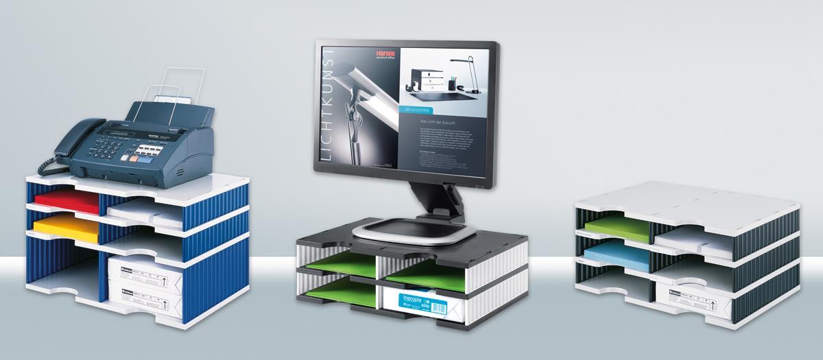 Diese stabile Papier- und Dokumentenablage lässt sich sehr vielfältig einsetzen, sei es freistehend auf einem Schreibtisch, in Regalen oder Schränken oder auch als kleine Drucker- oder Faxstation. Zwei verschiedene Fachhöhen - Standard und Jumbo - stehen zur Wahl. Sie lassen sich problemlos miteinander kombinieren. Die Basis-Einheiten können jederzeit mit weiteren Fächern aufgestockt werden. Teile einfach ohne Werkzeug aufeinderstecken - fertig! Sehr präzise und saubere Verarbeitung.