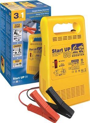 Multifunktionsgerät START UP 80Starten, Laden und TestenÜberwachungsfreie Ladung und StartfunktionBatterietestfunktion mit LED-StatusanzeigeSchutz der BordelektronikVerpolungsschutz mit WarnsigalDas START UP 80 ist ein Multifunktionsgerät zum Starten, Laden und Testen von 12 V Batterien.Das Gerät ermöglicht dank der Ladekennlinie W2 eine überwachungsfreie Ladung und hat eine Startfunktion für Blei-Kalzium-Starterbatterien. Außerdem verfügt das START UP 80 über eine Batterietestfunktion mit LED-Statusanzeige. Die Bordelektronik des Fahrzeuges wird geschützt und das Gerät ist durch ein Warnsignal vor Verpolung geschützt.Das START UP 80 wird mit vollisolierten Klemmen geliefert, die in einem integrierten Ablagefach verstaut werden können.Ausstattung: Ladekennlinie W2BatterietestfunktionVerpolungsschutz mit WarnsignalSchutz der BordelektronikStarten, Laden und Testen von 12 V BatterienÜberwachungsfreie Ladung und Startfunktion von Blei-Kalzium-StarterbatterienBatterietestfunktion mit LED-Statusanzeige.Technische Daten: Akkuspannung (LOV): 12 VBetriebsspannung: 230 VEmpfohlene Akku-Kapazität bei 12 V max.: 170 AhEmpfohlene Akku-Kapazität bei 12 V min.: 45 AhGeeignet für (Autobatterien): Blei-Calcium,Blei-SäureGewicht: 4.4 kgKfz-Ladegeräte-Art (Kategorisierung): Automatikladegerät,Kfz-Batterietester,SchnellstartsystemKfz-Ladegeräte-Besonderheiten: AkkutestLadestrom bei 12V: 25 AProduktabmessung, Breite: 17 cmProduktabmessung, Höhe: 31 cmProduktabmessung, Länge: 11.5 cmStarthilfestrom (12 V): 50 A