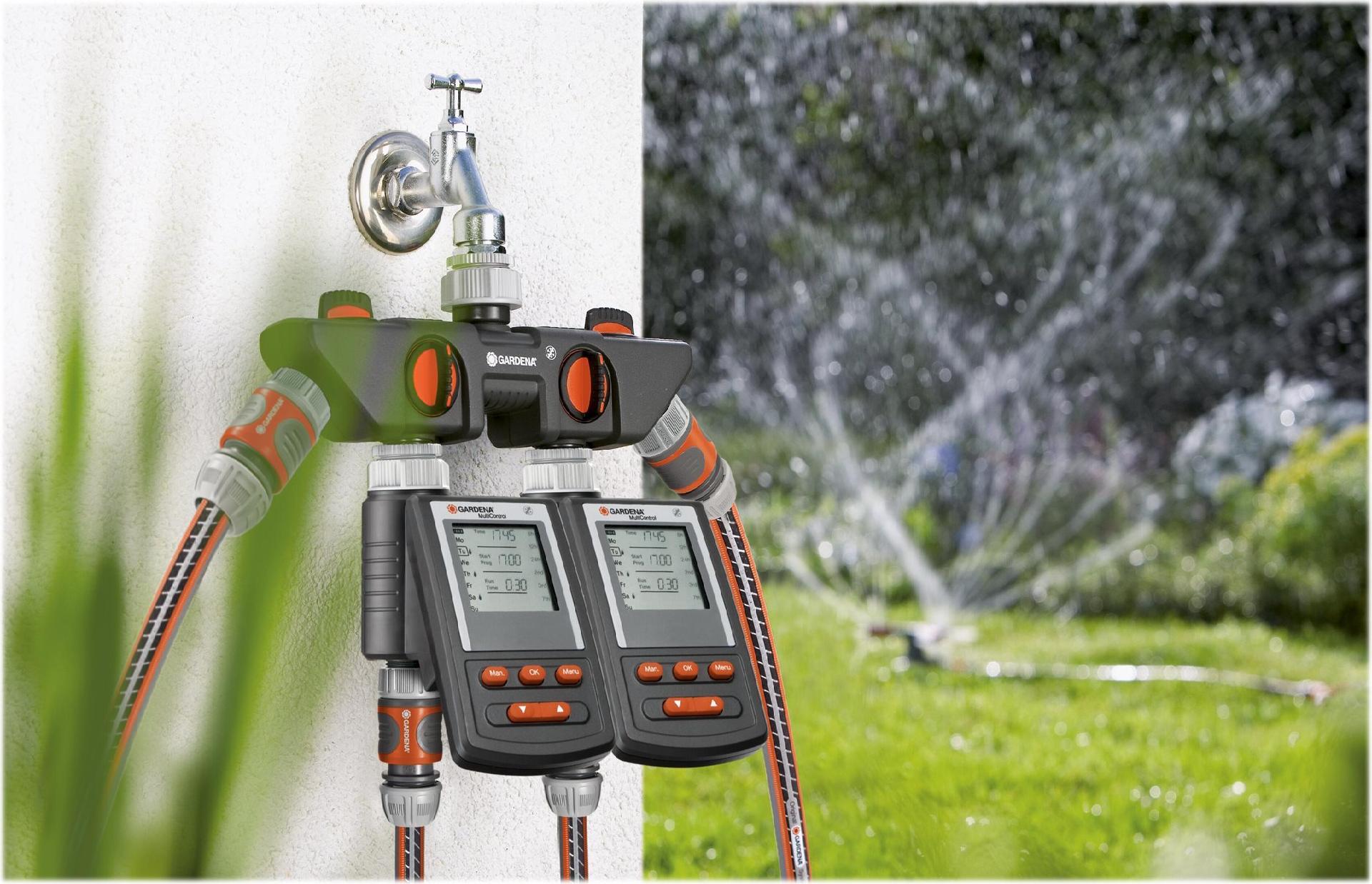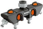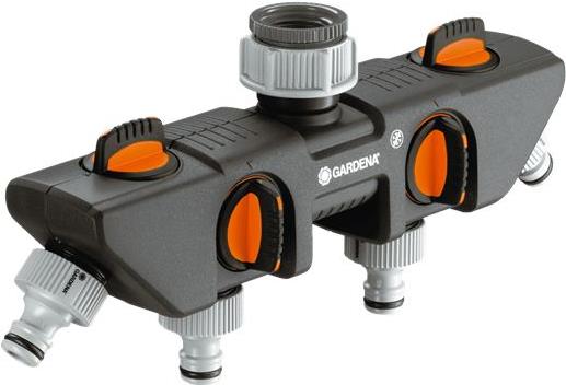 Der Gardena 4-Wege-Verteiler ermöglicht es, mehrere Anschlussgeräte gleichzeitig mit einem Wasserhahn zu verbinden. An den 4-Wege-Verteiler können zwei Gardena Bewässerungscomputer oder Bewässerungsuhren angebracht werden.