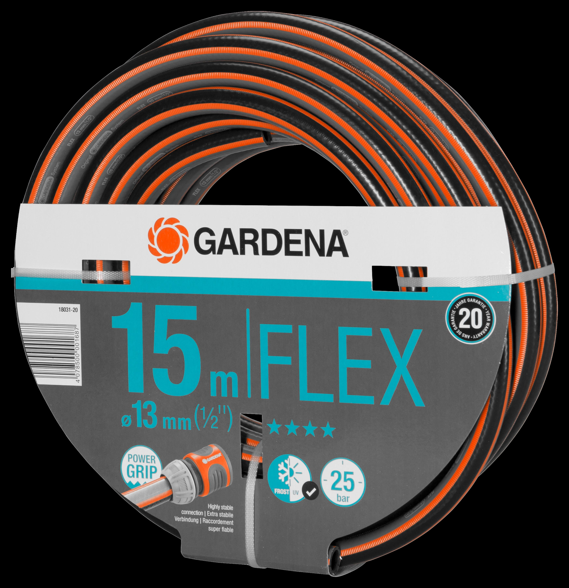Der Gardena Comfort FLEX Schlauch mit Power-Grip-Profil garantiert die optimale Verbindung von Schlauchstück und Schlauch. Beide greifen dank neuartiger Technik wie Zahnräder ineinander. Der Schlauch ist druckfest und formstabil, gleichzeitig aber auch flexibel und einfach in der Handhabung. Er verknotet und verdreht sich nicht. Dies sind die besseren Voraussetzungen für einen komfortablen und vielseitigen Einsatz im Garten. Bei Bedarf können Sie ihn mit den Original Gardena Systemteilen und Anschlussgeräten systematisch ergänzen. Er ist frei von giftigen Weichmachern (Phthalaten) und Schwermetallen und selbstverständlich UV-beständig.Produkttext[/head]Der GARDENA Comfort FLEX Schlauch mit Power-Grip-Profil garantiert die optimale Verbindung von Schlauchstück und Schlauch. Beide greifen dank neuartiger Technik wie Zahnräder ineinander. Das Power-Grip-Profil schafft das, was sich Gartenbesitzer wünschen: Eine zuverlässige Verbindung mit optimaler Haltekraft. Positiver Nebeneffekt des Profils: Der Schlauch lässt sich leichter aufrollen und gleitet gut. Dank des Spiralgewebes mit zwei gegenläufigen Spiralen ist der Schlauch druckfest und formstabil, gleichzeitig aber auch flexibel und einfach in der Handhabung. Er verknotet und verdreht sich nicht. Dies sind die besten Voraussetzungen für einen komfortablen und vielseitigen Einsatz im Garten. Bei Bedarf können Sie ihn mit den Original GARDENA Systemteilen und Anschlussgeräten systematisch ergänzen. Er ist frei von giftigen Weichmachern (Phthalaten) und Schwermetallen und selbstverständlich UV-beständig. Seine hohe Wandstärke macht den Schlauch robust und langlebig. Berstdruck: 25 bar. GARDENA gewährt Ihnen auf diesen Schlauch 20 Jahre Garantie.[head]Hauptmerkmale