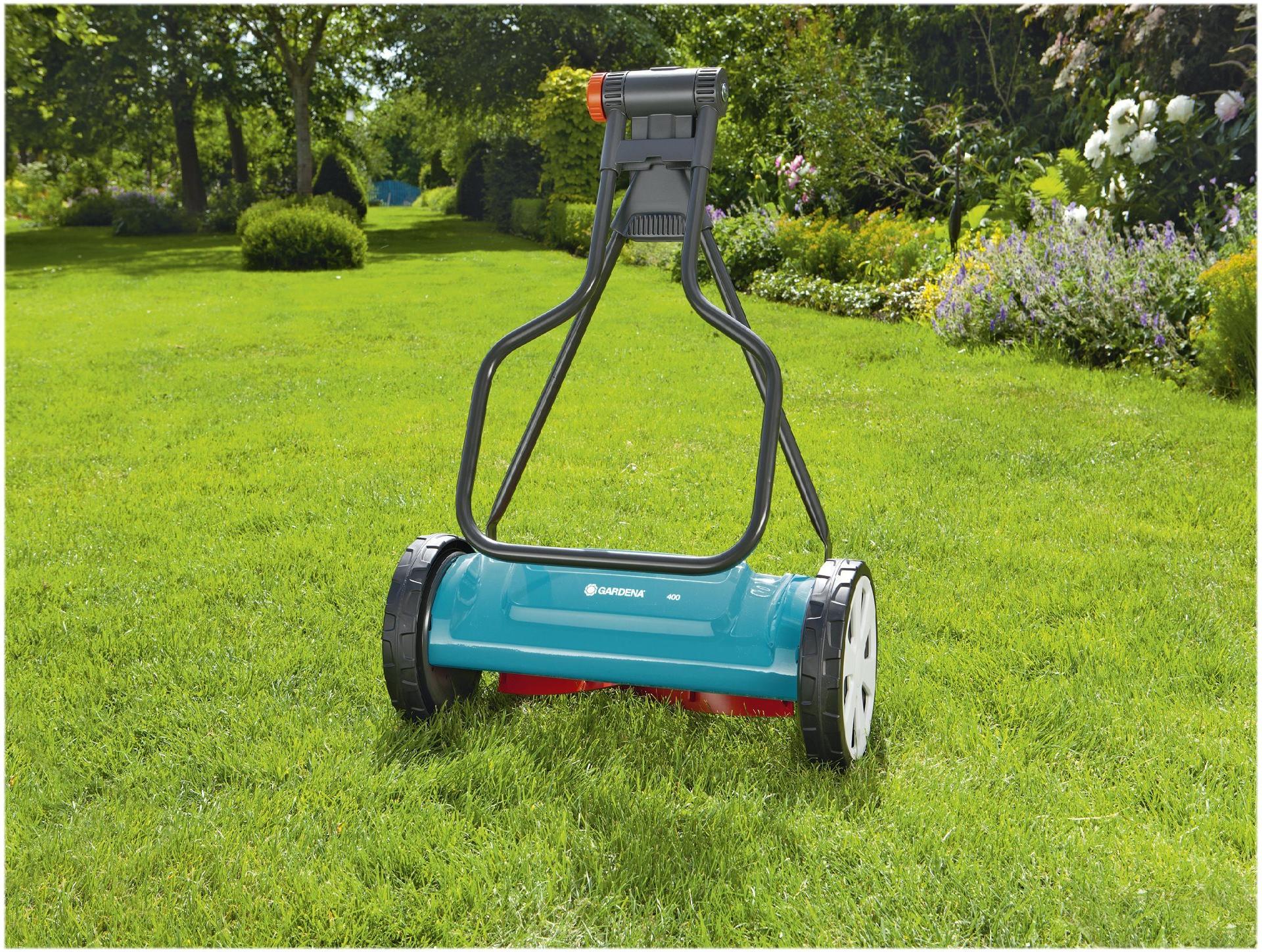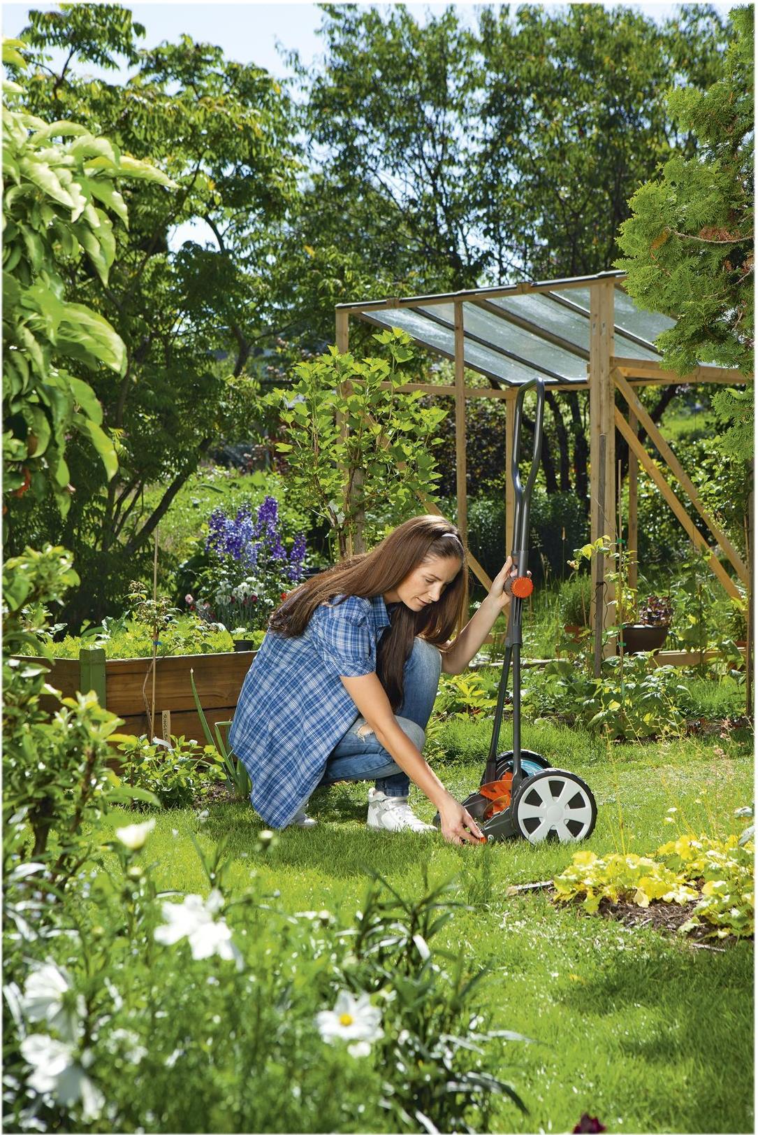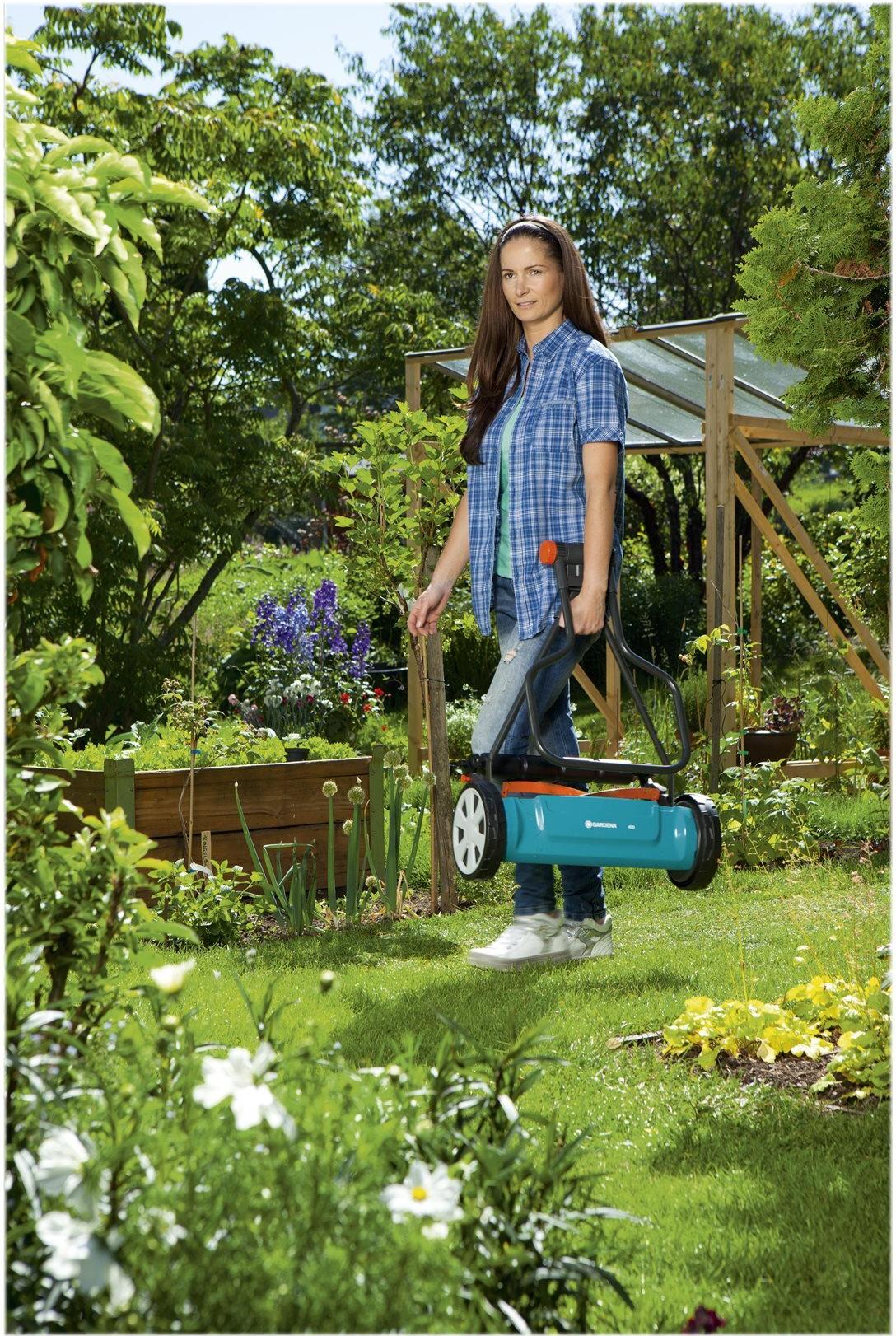 Mit dem Spindelmäher Classic 400 von GARDENA mähst Du Deinen Rasen umweltfreundlich ohne Strom - und das geräuscharm. Ausgestattet ist der Handrasenmäher mit einer berührungslosen Präzisions-Schneidtechnik. Beim Schieben dreht sich eine gehärtete, antihaftbeschichtete Messerwalze aus Qualitätsstahl an einem feststehenden Gegenmesser vorbei. Das Besondere: Die Messerwalze und das geschliffene Untermesser berühren sich nicht und ermöglichen ein angenehmes und geräuscharmes Arbeiten sowie ein leichtes Schieben. Dadurch schneidest Du Grashalme auf einer Fläche bis zu 200 m² für einen gepflegten Rasen exakt wie mit der Schere. Die Griffform bietet Dir einen guten Halt und das Führen des Spindelmähers wird durch die beiden großen Räder mit Spezialprofil erleichtert. Mit Hilfe der Regler bestimmst Du die Schnitthöhe in vier Stufen zwischen 12 und 42 mm. Dank seines geringen Gewichtes von 8,9 kg überzeugt der Rasenmäher mit guter Mobilität. Du kannst den Spindelmäher durch das teilbare Gestänge schnell und einfach zusammenklappen. Die Aufbewahrung ist so besonders platzsparend und der Transport einfach.