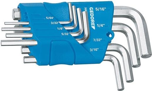 Gedore 1505424 Innen-Sechskant Winkelschraubendreher-Set 8teiligWinkelschraubendreher-Set im Halter 8tlg. 5/64\" - 5/16\"Zöllige Winkelschraubendreher im blauen Kunststoff-Einsteckhalter.Technische Daten: Abtrieb: Innen-Se