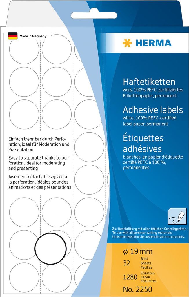 HERMA - Permanentklebeetiketten - weiß - 19 mm rund 1280 Etikett(en) (32 Bogen x 40) (2250)