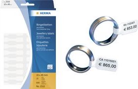 Selbstklebende Ring-Etiketten aus weißem Halbkarton, nicht klebender Mittelsteg. Zum Auszeichnen von Ringen, Uhren, Schmuck, Brillen und Gegenständen mit geringem Durchmesser, z. B. Kabel. Einfach die Klebeflächen zusammenkleben - fertig. Umweltfreundlich: hochwertiges, chlorfrei gebleichtes Spezialpapier, lösemittelfreier Haftkleber. Blattformat 111 x 170 mm. Zur Handbeschriftung mit allen Schreibgeräten und Schreibmaschinen. Nicht für PC-Beschriftung geeignet, nutzen Sie dafür HERMA Ringetiketten auf A4-Blättern.